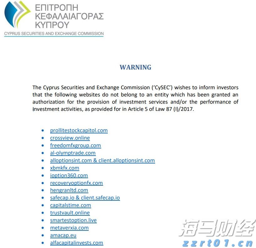 塞浦路斯证券交易委员会(CySEC)警告公众,不要与16个投资公司进行交易,这些公司被指控在没有适当注册的情况下运营。这些实体因缺乏提供投资服务或进行投资活动所需要的许可被监管机构标记。